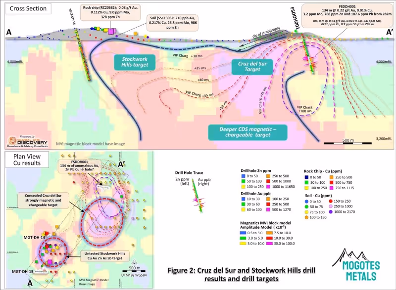 In this context, further drilling at CDS is a priority to test if the anomalous Au-Zn-Pb (Cu) mineralisation intersected in hole FS-DDH-001 is a pyritic Au-base metal halo to the conceptual porphyry Cu-Au target centred on the magnetic – chargeable anomaly located under gravel cover to the SE and continuing to depth. Mogotes exploration at Stockwork Hills has also highlighted a new untested Cu-Au target with coincident approx. 500 m diameter soil and rock chip Cu-Au anomaly with an underlying IP chargeability and magnetic anomaly potentially representing a mineralised outflow from the conceptual CDS magnetic – chargeable (porphyry) target at depth.