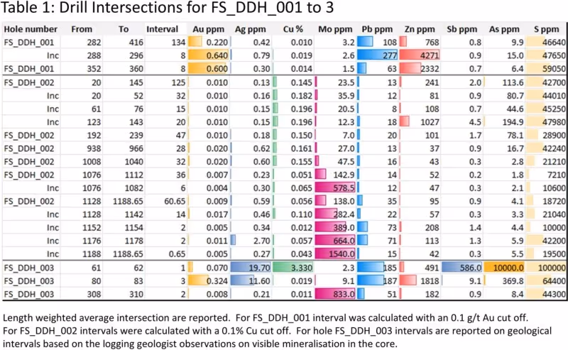 Assay results from FS-DDH-001 are anomalous in Au-Zn-Pb (Cu). At a 0.1 g/t Au cut off the better mineralised interval returned 134 m at 0.22 g/t Au 768 ppm Zn and 107.6 ppm Pb from 282 m down hole, with a best individual intersection of 2 m at 1.27 g/t Au, 1.16% Zn, 270 ppm Pb and 296 ppm Cu from 290 m (Table 1).