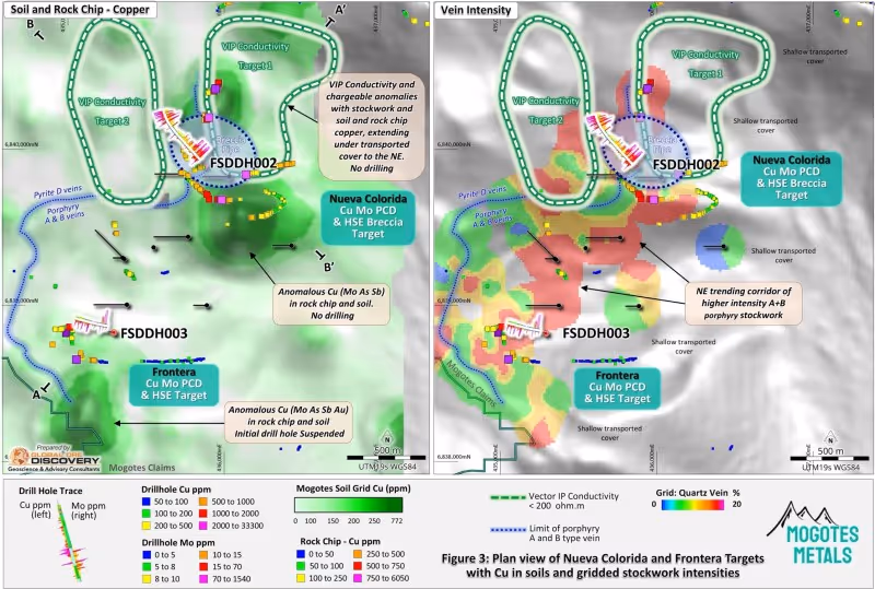 Frontera drill hole FSDDH003 was designed to test for higher grade porphyry Cu-Mo (Au) mineralization to depth beneath combined stockwork, alteration, geochemical and geophysical anomalies that all suggest the current outcrop level at the prospect represents an outer phyllic alteration shell of a concealed porphyry system with an advanced argillic HSE overprint, with the potential for improved Cu-Mo grades at depth.