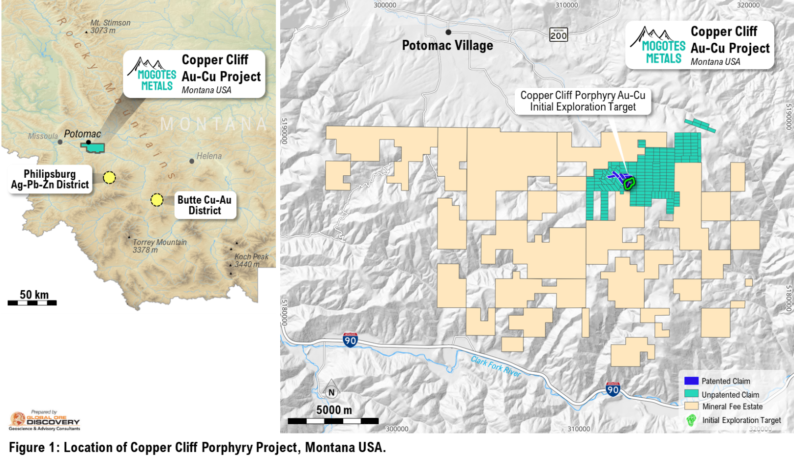 The Copper Cliff Project is located within the US state of Montana in the Garnet Range, 13 km south-east of the town of Potomac, 55 km north-west of Philipsburg Ag-Pb-Zn skarn and 115 km from the large-scale the Butte Cu-Mo (Au-Ag) porphyry historic mining districts1 (Figure 1). The Project covers the historic Copper Cliff mining district which operated intermittently from the early 1890’s to 1940’s with estimated production of 110k lbs of copper 260 oz Au and 570 oz Ag from supergene mineralization 2,3.