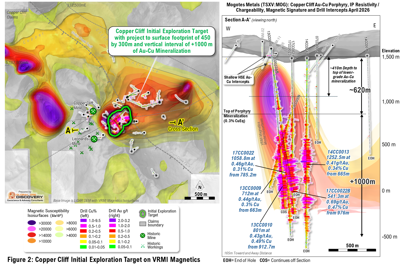 During 2006 to 2017 Kennecott / Rio Tinto Exploration discovered a significant body of Au – Cu porphyry mineralization drilling to depth under the district scale advanced argillic (AA) to phyllic “lithocap” alteration system that is host to the historic Cu-Au mineralization2,3. The Copper Cliff porphyry and large land package are considered by Mogotes Metals to be significantly underexplored and very attractive for further discovery of Au-Cu mineralization.